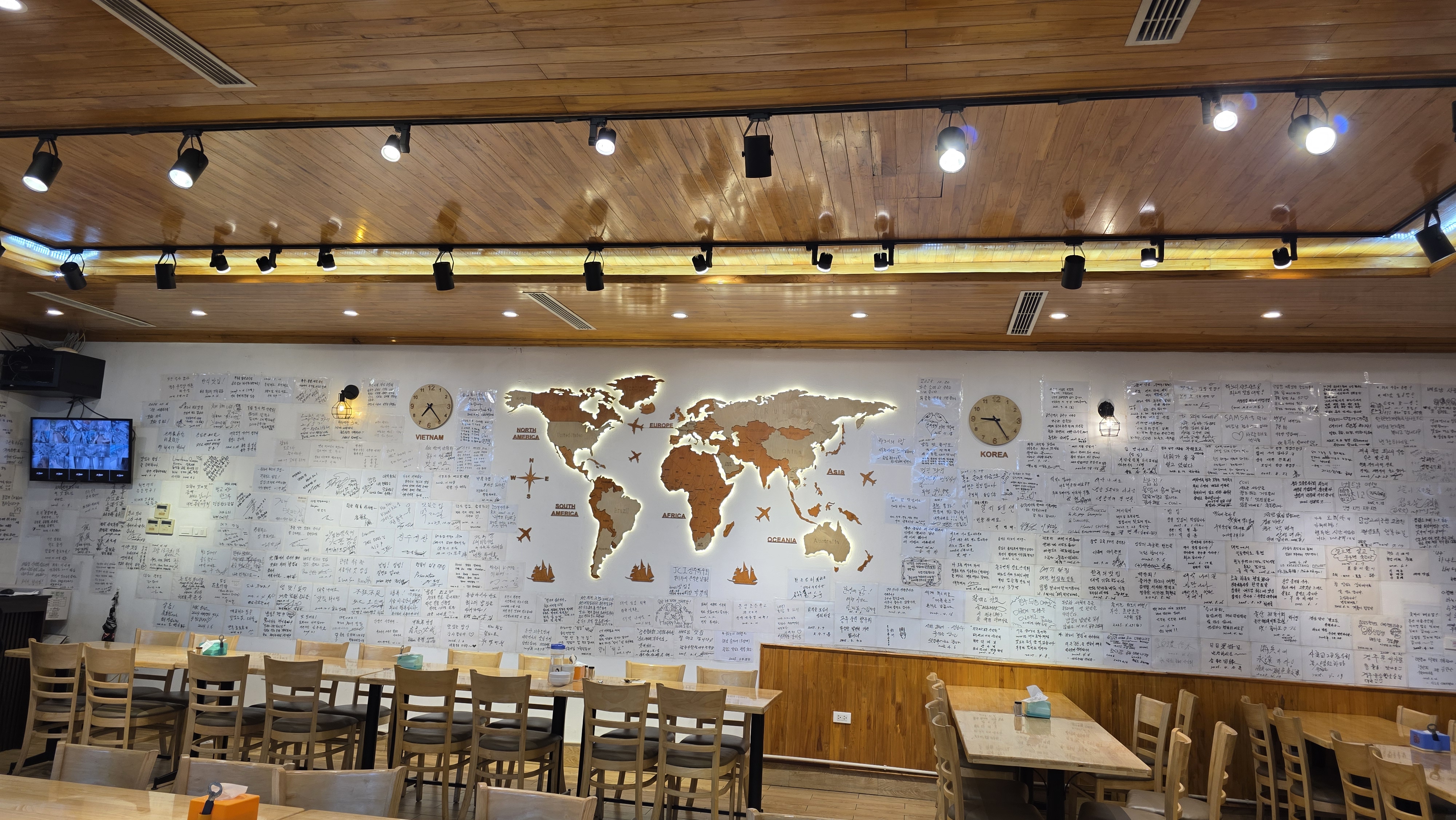 세계지도와 함께 다녀간 사람들의 메모가 가득찬 매장